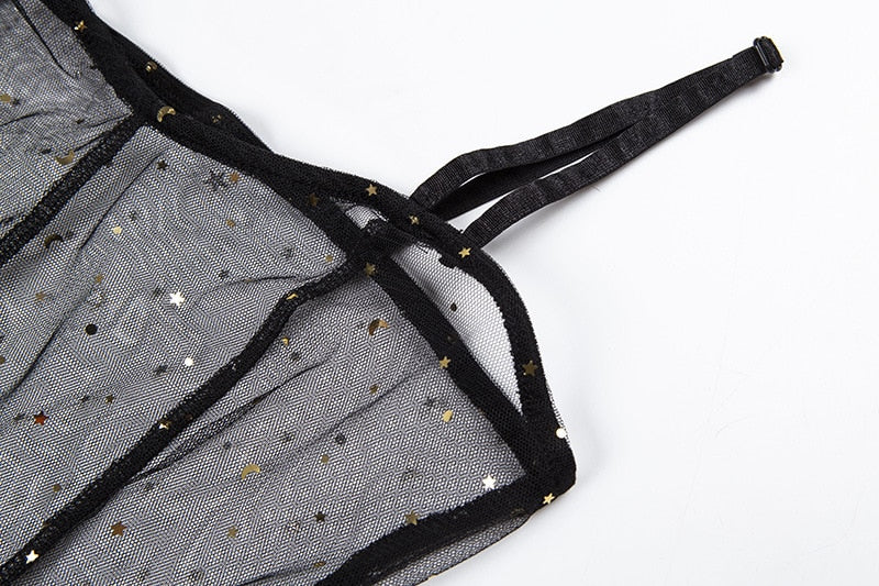 Ärmelloses Maxi-Netzkleid in Schwarz, Boho-Stil, mit transparentem Netzgewebe und Pailletten, perfekt für den Sommer.